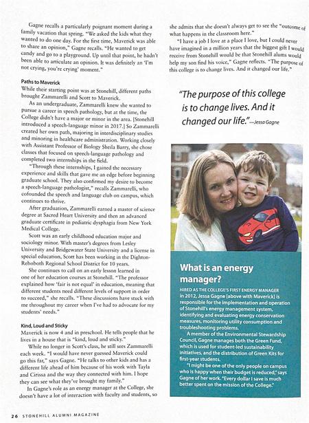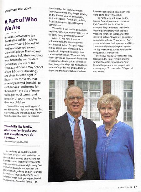 Here is an article for my community that I worked on with the editor of the Stonehill Alumni Magazine. For this article, I helped make edits to help the overall grammar, flow, and readibilty while still maintaining the author's voice.